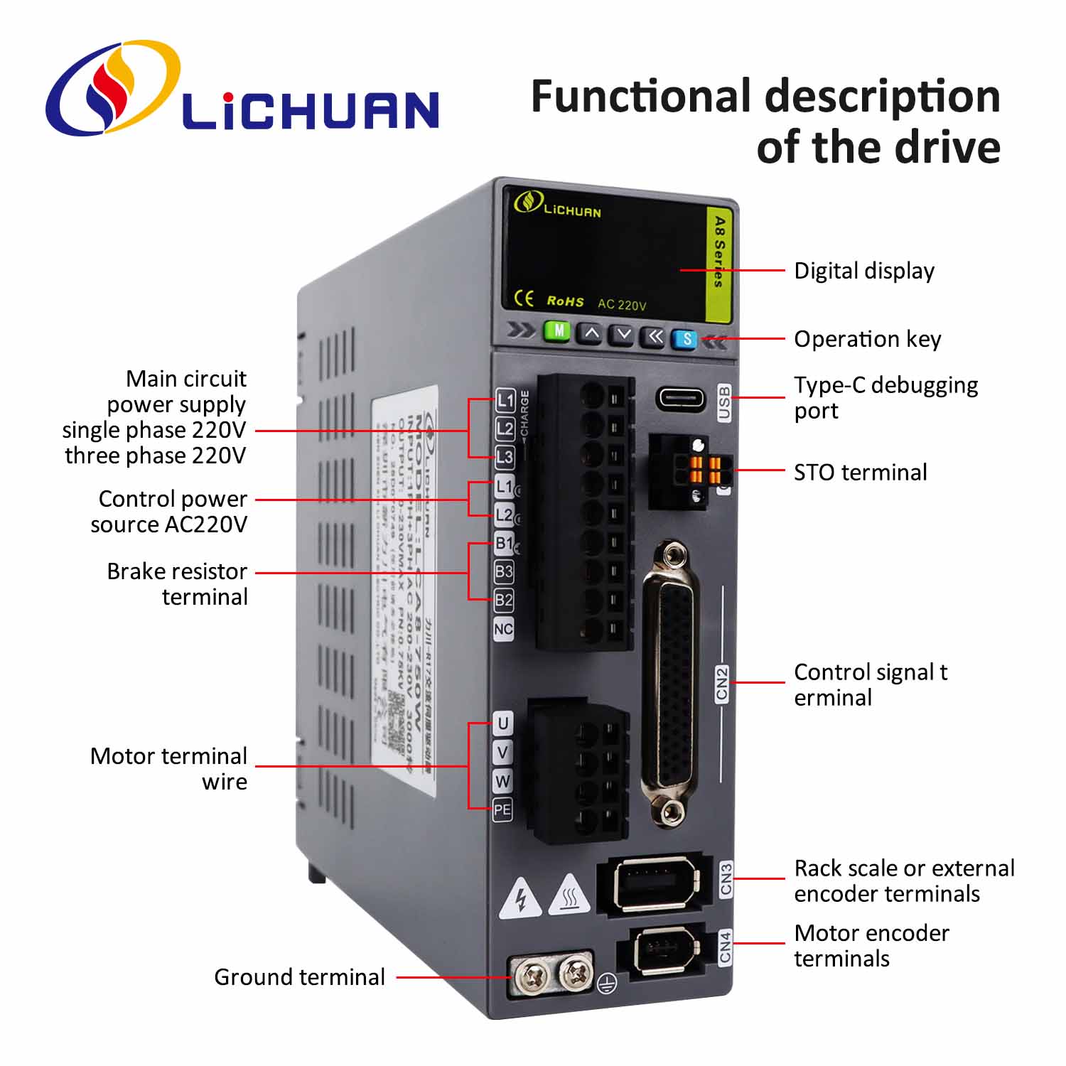 یہ سلسلہ ایک اعلی کارکردگی والے AC سروو ڈرائیو ہے جس میں مربوط STO (سیف ٹارک آف) سیفٹی ٹورک شٹ ڈاؤن فنکشن ہے ، جو IEC 61800-5-2 حفاظتی معیار کے مطابق ہے اور ہنگامی صورت حال میں محفوظ شٹ ڈاؤن حاصل کرسکتا ہے۔ یہ نظام ایک مکمل بند لوپ کنٹرول وضع کی حمایت کرتا ہے ، اور اعلی ریزولوشن انکوڈر آراء کے ذریعہ ± ایک نبض کی پوزیشننگ کی درستگی کو حاصل کرتا ہے ، جو گھومنے والی موٹروں اور لکیری موٹر ایپلی کیشن کے منظرناموں کے ساتھ مطابقت رکھتا ہے۔ یہ ٹائپ سی ڈیبگنگ انٹرفیس سے لیس ہے ، ریئل ٹائم پیرامیٹر کنفیگریشن کی حمایت کرتا ہے ، اور اس میں بلٹ ان آر ایس 485 مواصلات انٹرفیس (موڈبس آر ٹی یو پروٹوکول) ہے ، اور بوڈ کی شرح کو 9.6kbps ~ 115.2KBPS سے ایڈجسٹ کیا جاسکتا ہے۔ یہ مقناطیسی فیلڈ واقفیت کنٹرول (ایف او سی) الگورتھم کو اپناتا ہے ، جو اعلی متحرک ردعمل کے مواقع جیسے صحت سے متعلق سی این سی اور سیمیکمڈکٹر آلات کے لئے موزوں ہے۔