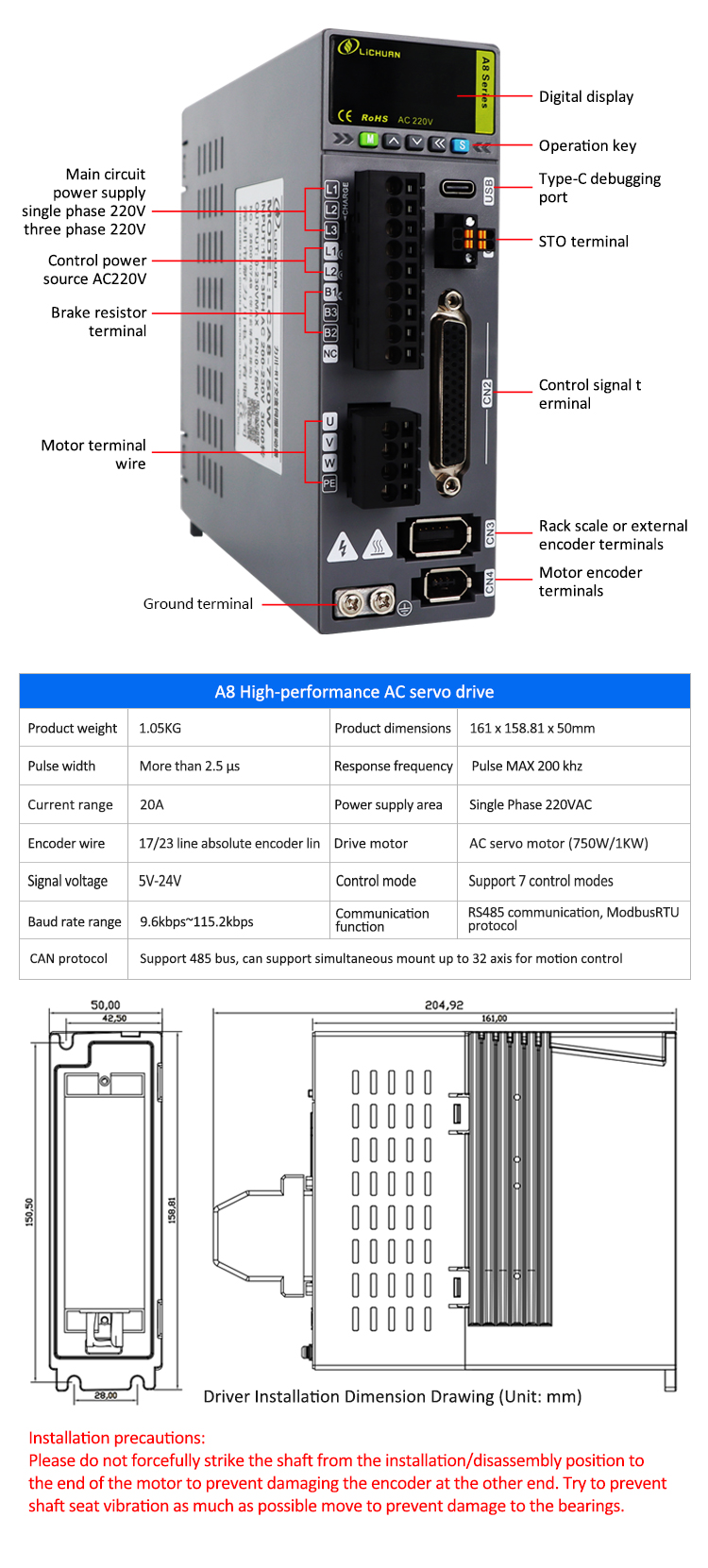 یہ سلسلہ ایک اعلی کارکردگی والے AC سروو ڈرائیو ہے جس میں مربوط STO (سیف ٹارک آف) سیفٹی ٹورک شٹ ڈاؤن فنکشن ہے ، جو IEC 61800-5-2 حفاظتی معیار کے مطابق ہے اور ہنگامی صورت حال میں محفوظ شٹ ڈاؤن حاصل کرسکتا ہے۔ یہ نظام ایک مکمل بند لوپ کنٹرول وضع کی حمایت کرتا ہے ، اور اعلی ریزولوشن انکوڈر آراء کے ذریعہ ± ایک نبض کی پوزیشننگ کی درستگی کو حاصل کرتا ہے ، جو گھومنے والی موٹروں اور لکیری موٹر ایپلی کیشن کے منظرناموں کے ساتھ مطابقت رکھتا ہے۔ یہ ٹائپ سی ڈیبگنگ انٹرفیس سے لیس ہے ، ریئل ٹائم پیرامیٹر کنفیگریشن کی حمایت کرتا ہے ، اور اس میں بلٹ ان آر ایس 485 مواصلات انٹرفیس (موڈبس آر ٹی یو پروٹوکول) ہے ، اور بوڈ کی شرح کو 9.6kbps ~ 115.2KBPS سے ایڈجسٹ کیا جاسکتا ہے۔ یہ مقناطیسی فیلڈ واقفیت کنٹرول (ایف او سی) الگورتھم کو اپناتا ہے ، جو اعلی متحرک ردعمل کے مواقع جیسے صحت سے متعلق سی این سی اور سیمیکمڈکٹر آلات کے لئے موزوں ہے۔